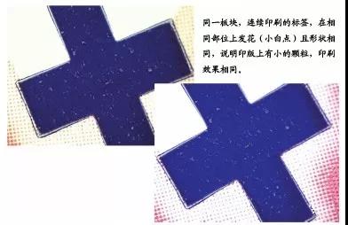3. 纸粉原因造成的白点一般情况下都有规律,也就是这类白点有连续性。这些纸粉粘在版上,相当于特殊的印版,印刷后这些有问题的图纹连续存在,相邻标签的白点外形是一致的,通过放大镜观察,很容易发现这个问题。
