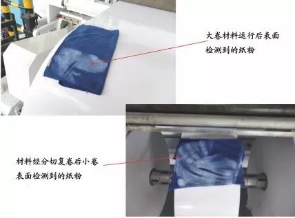 例如,在材料大卷分切过程中,分切机在导辊上和分切、收卷工位上出现大量纸粉,数量超过正常材料分切时的纸粉数量。若用黑色的抹布擦拭材料表面,可以见到明显的纸粉。而在擦拭正常的材料表面时,很少或几乎看不到纸粉。