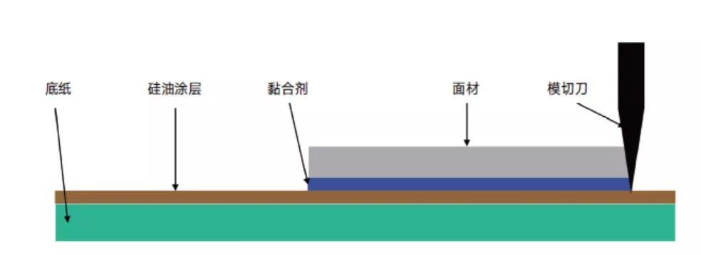 不干胶材料是一种复合材料,模切也不同于传统印刷材料的模切,如纸张模切是将材料整体切穿;而不干胶材料的模切仅是将面材和黏合剂层切穿,保留底纸和其表面的硅油涂层,最终使模切成型的标签粘接在底纸上备用。