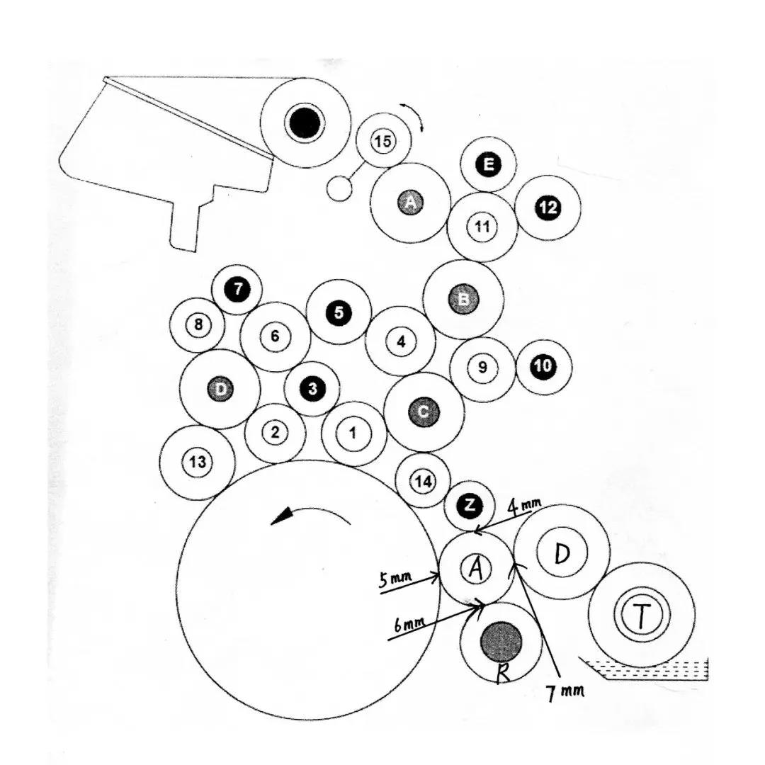 水斗辊(T)、计量辊(D)、靠版水辊(A)对印版的供水都是直线匀速传递,只有串水辊(R)是来回小幅度的窜动。