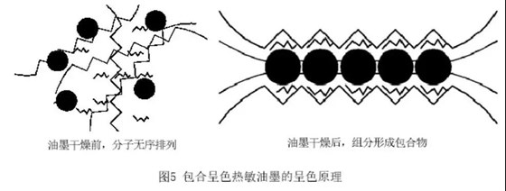 如图5~6所示,包合呈色热敏油墨呈色原理为:油墨干燥前,油墨组分做随机布朗运动,此时油墨呈透明色;油墨干燥过程中,油墨组分之间发生自由组装,高分子链在客体分子四周呈定向排列,形成绿色包合物,为干燥后的油墨提供初始颜色,但该包合物分子间仅通过范德华力结合在一起,稳定性较差,处于包合物中央的客体分子吸收一定热量后,分子动能增大,当其吸收的能量达到逃逸所需的活化能时,客体分子可以从包合物中逃逸,且其逃逸速度与环境温度有关,即:温度越低,客体分子逃逸速度越慢;温度越高,客体分子逃逸速度越快。随着客体分子的逃逸,起呈色作用的包合物也随之减少,在这个过程中,油墨颜色逐渐由绿色变为蓝色并最终变为透明色。
